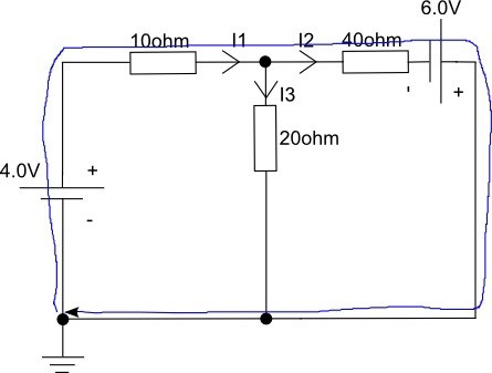Summan av spänningsförändringarna i ett sånt här varv ska bli noll, dvs: 4 - 10*I1 - 40*I2 + 6 = 0