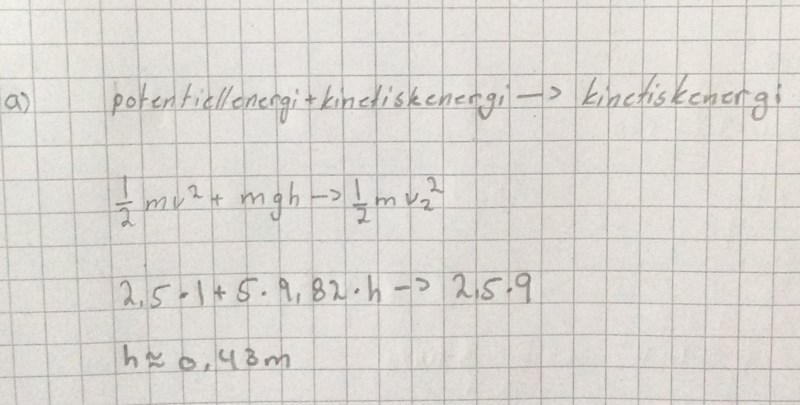 Ja det är det som är felet. Du delar högerledet med (2,5+5×9,82) men du har inte delat vänsterledet med samma sak för där har du bara h kvar.