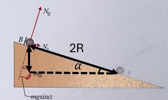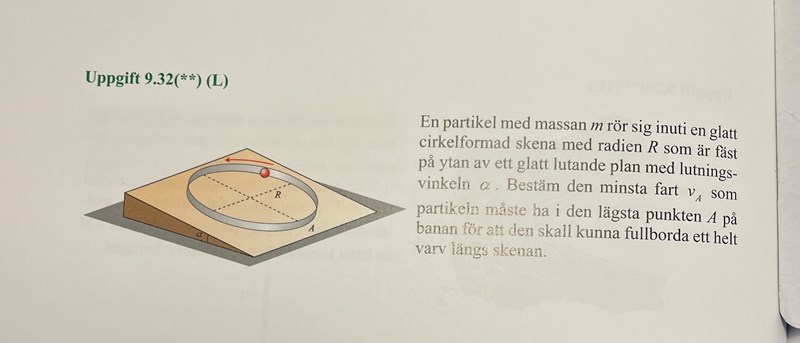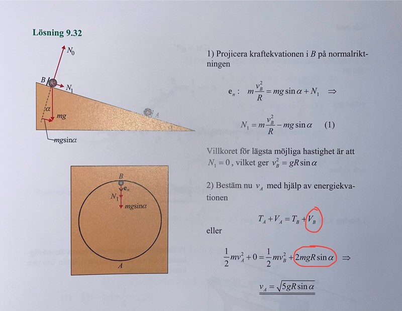 Har inte den potentiella energin med läge (höjd) att göra? Jag förstår att vi ansätter punkt A som nolläget och att den potentiella energin i punkt A således är noll. Men hur kommer man fram till den potentiella energin i punkt B? (Jag förstår dock att tyngdkraftskomponenten som är parallell med banan är mgsin(a), men varför är detta med i uttrycket för partikelns potentiella energi vid punk B?)