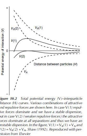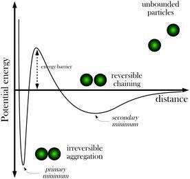 Texten bygger på DLVO-teorin. Grafen visar energin som en funktion av avståndet mellan två kolloidala partiklar. Man får fram den genom att kombinera elektrostatisk repulsion mellan partiklarnas laddningar, van der Waals-attraktion samt elektrostatisk repulsion mellan elektronorbitalerna när partiklarna kommer väldigt nära varandra.