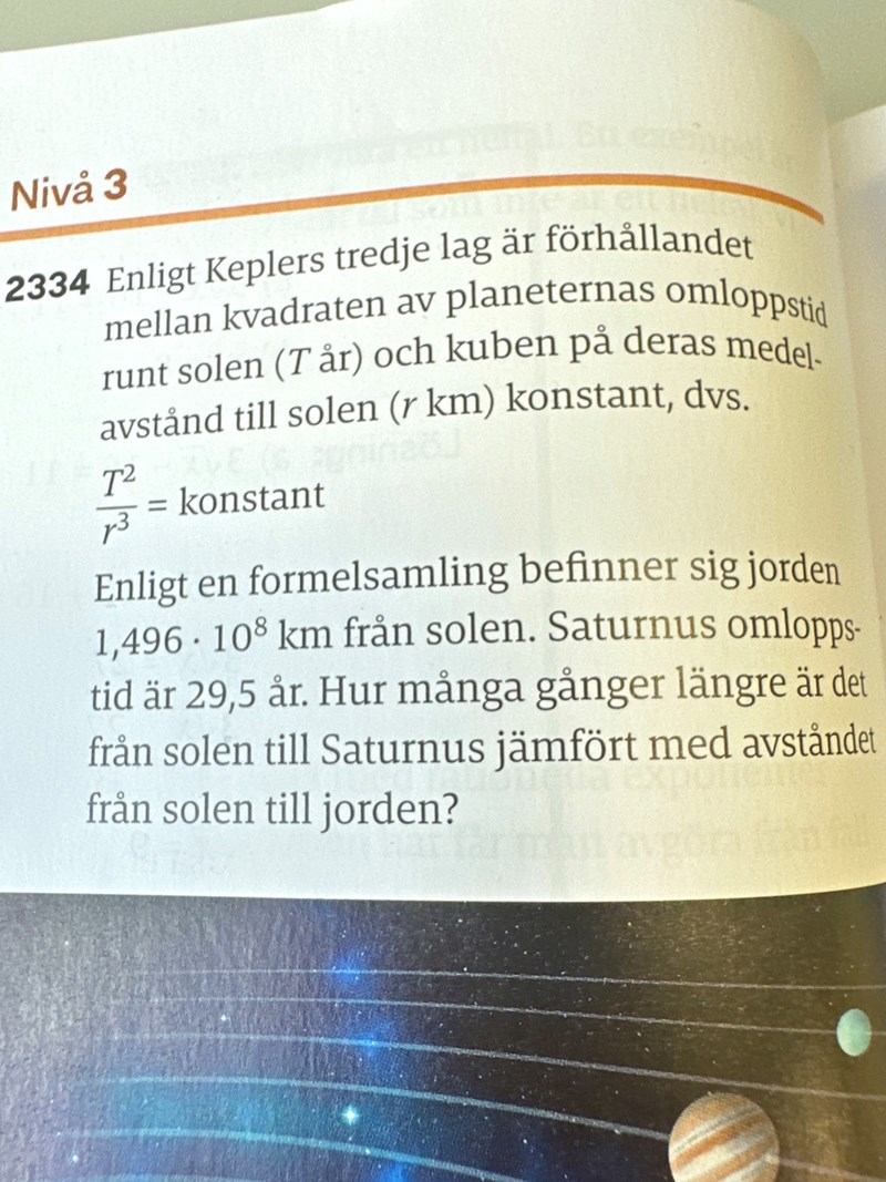 Jag har varit fast på den här uppgiften hur länge som helst och jag har testat Saturnus omloppstid som T och jordens avstånd som r men jag har inte kommit någonstans. Jag vet inte hur jag ska tänka.