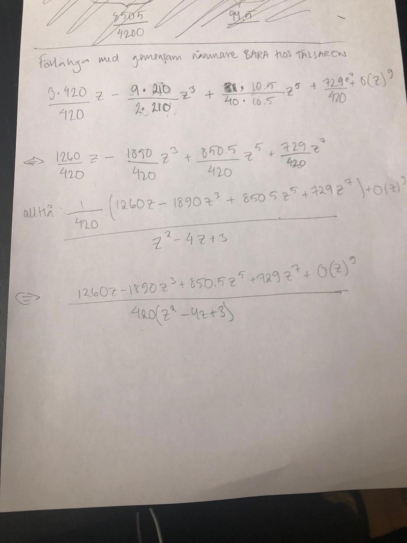 Ta ett godtyckligt fjärdegradspolynom. Du får kalla koefficienterna vad du vill, jag väljer a, b osv. ax4 + bx3 + cx2 + dx + e. (Vi behöver inte e i den vanliga betydelsen.) Jag kallar polynomet p(x). Vet du vad ansätta betyder? Man kan se det som en kombination av "anta" och "sätta in", om man vill. Vi vet inte hur polynomet ska se ut, men vi tar ett som kan fås att passa in på alla fjärdegradspolynom, och räknar med att vi kan få fram värden på alla koefficienter. Nu ska det gälla att p(z)*(z2-4z+3) = sin(3z) (fast inte riktigt, det är McLaurin-utvecklingen av sin(3x) där vi har kastat bort allt av grad 5 eller mer).