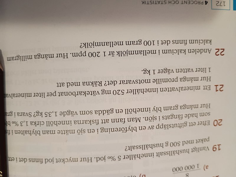 Uppgift 22, jag försökte omvandla ppm till nummer= 1200ppm - 0,0012 sen kom jag inte längre.