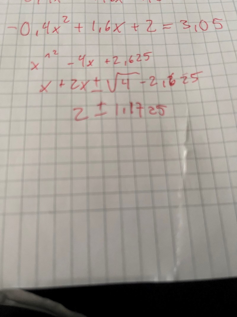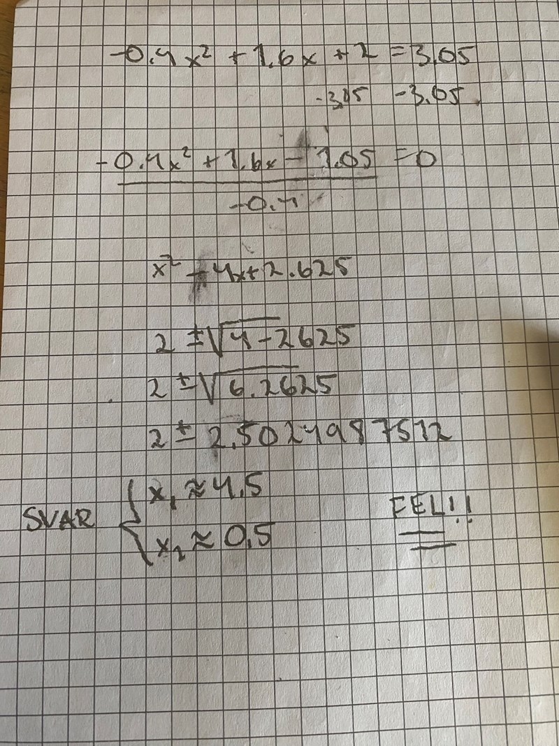 -0,4x^2 + 1,6x + 2 - 3,05 = 0 tror jag
