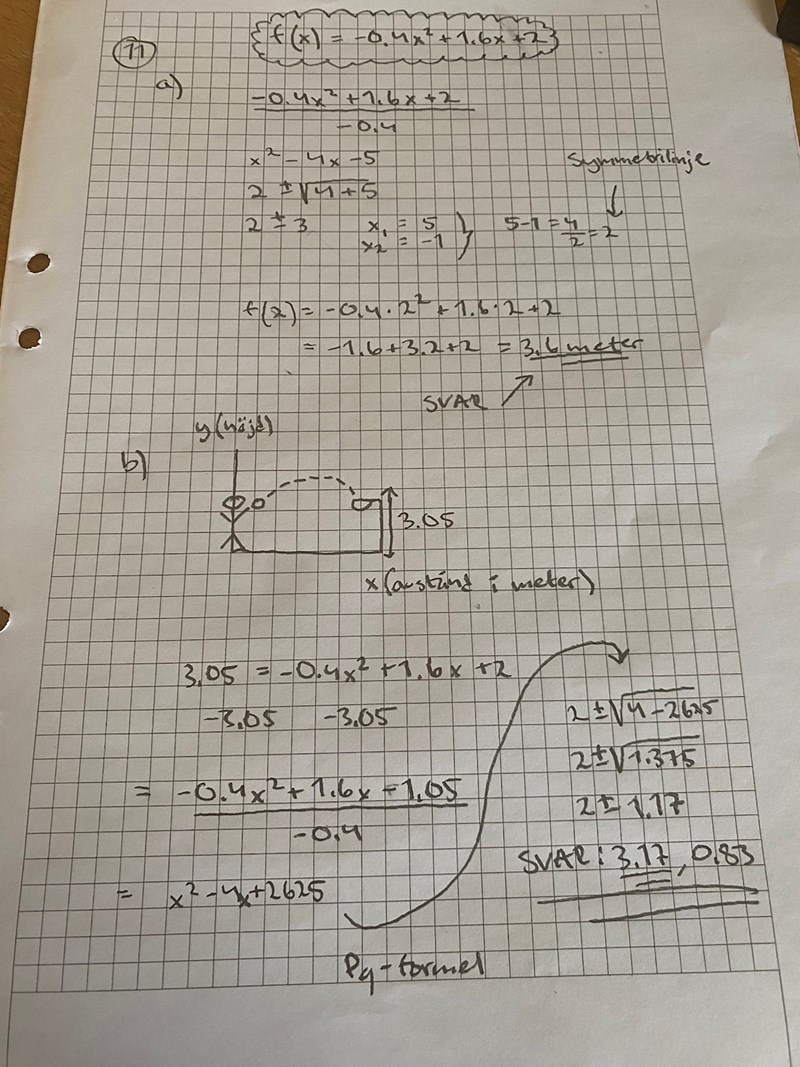 Fråga a) löste jag genom att ta p/ halva, alltså hitta symmetrilinjen och därmed sätta in den i ekvationen. Satte in x = 2 och fick svaret att bli 3.6 meter. Hur som helst, b) - frågan förstår jag mig inte på hur jag ska ta mig ann.
