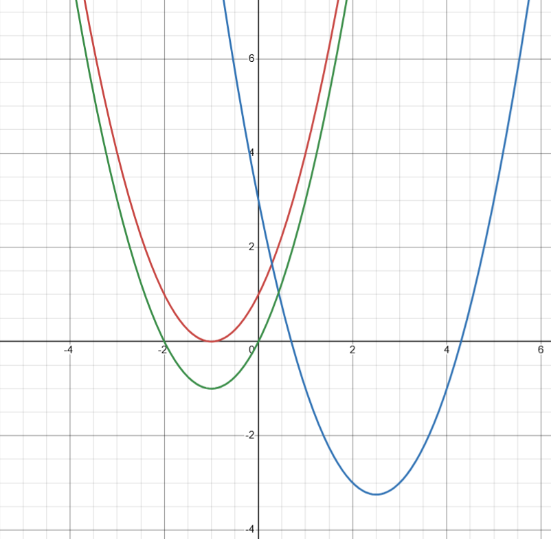 Här har du en bild på tre olika andragradare (inte relaterade till frågan). Den gröna och den blåa korsar x-axeln (alltså att de har värdet 0, en rot) medan den röda bara korsar x-axeln en gång.