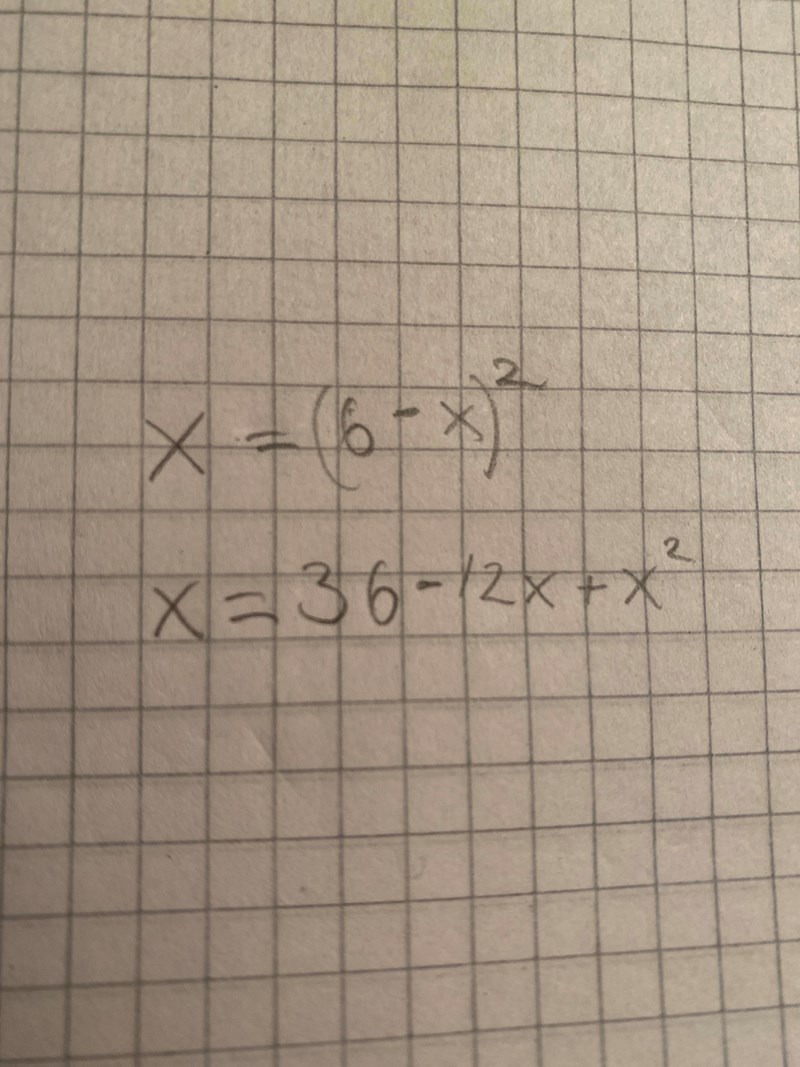 eftersom du har ett minustecken mellan termerna ska du använda andra kvadreringsregeln, alltså a-b2 = a2-2ab+b2. I detta fall är 6 ditt a och x ditt b. Kan du lösa uppgiften då? :)