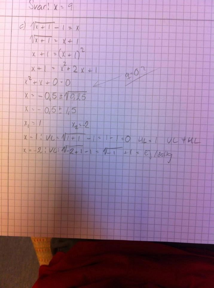Hej, jag behöver hjälp med en rotekvation, från Matematik 5000 2c uppgift 2258 c, s.96. Se bild, vad gör jag för fel? Tack i förhand!