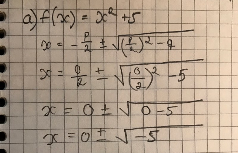Om det hade varit ekvationen x^2 + 5 = 0 så saknar den reella lösningar. Det är därför du får ett negativt tal under rottecknet.