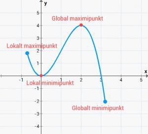 *Maximipunkt – En punkt där derivatan är positiv innan punkten, noll i punkten och negativ efter. En maximipunkt kan också vara slutet av ett intervall om punkten är inkluderad i intervallet och kurvan är på väg uppåt.