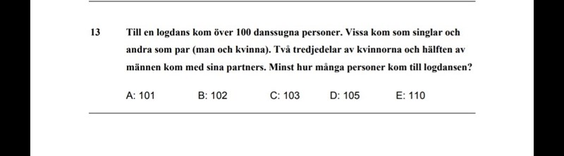 Mogens skrev:Jag har inte tänkt jättenoga men en början är att om en kvinna kom med sin partner så kom den partnern också med sin partner. Några antal är alltså lika.