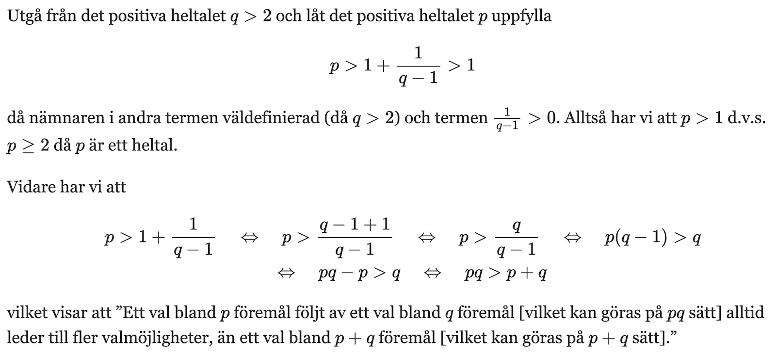 Visa att ett val bland p föremål följt av ett val bland q föremål alltid leder till fler valmöjligheter, än ett val bland p+q föremål, förutsatt att
