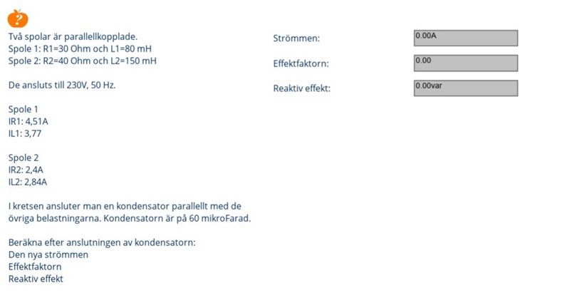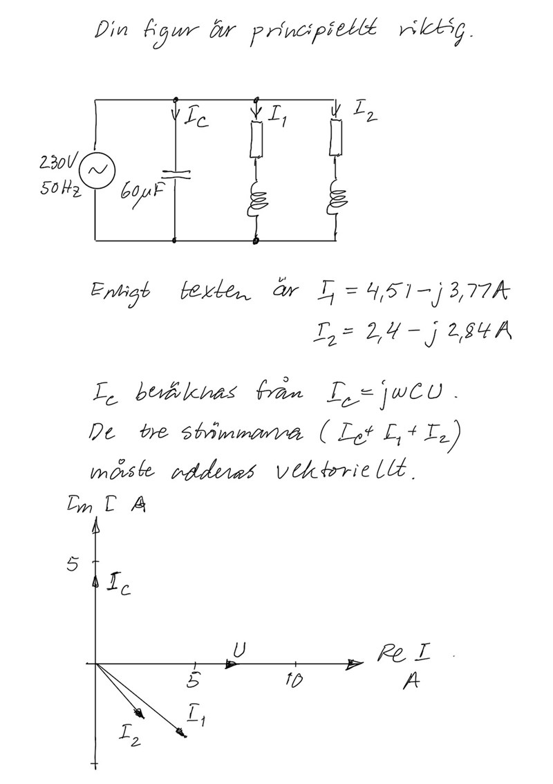 Jag har problem med att förstå hur man infogar kondensatorn in i kretsen, jag kan utan problem få fram Effekttriangeln för Spole 1 och 2 tillsammans. Skulle behöva få en förklaring hur man löser uppgiften, samt hur man generellt handskas med faskompensering.