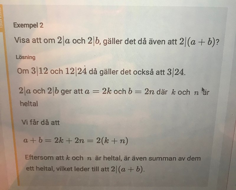 LittleMissM skrev:Kan ni förklara vad a = 2k och b = 2n är, hur man ska tänka? Vad har de att göra med 2|a och 2|b