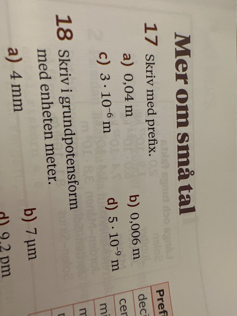 I tabellen utanför bilden står det nog att prefixet nano (förkortat n) betyder 10-9, så det kan du använda i uppgift d.