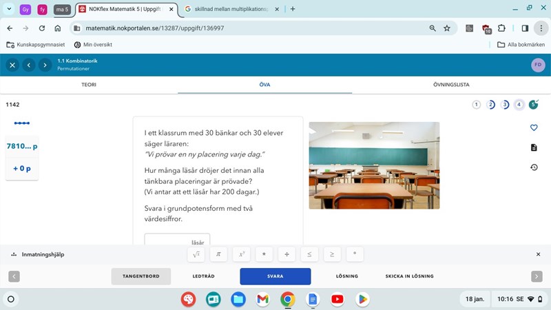 Aha nu tror jag att jag förstår, så de vill placera dessa 30 elever på varsin bänk, men om de hade frågat efter antal kombinationer som vi kan sätta dessa elever på i dessa 30 bänkar då hade vi kunnat ta 30*30?
