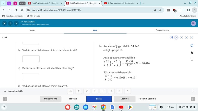 Ja så kan man också göra för b) men då använder man ej kombinatorik vilket de vill att vi ska göra i detta avsnitt, så försöker förstå varför de har använt kombinationer istället för permutationer.