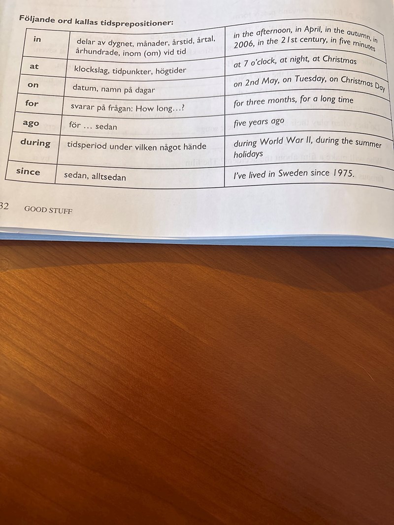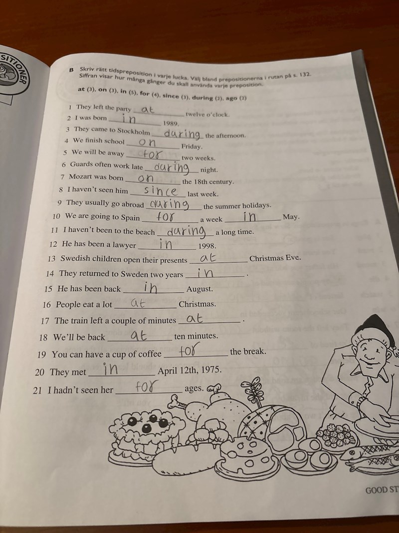 Använd bokens beskrivningar för att avgöra vad som är rätt; jag ser åtminstone 2 fel till (om du inte hittar dem, fråga). Dessutom hjälper siffrorna ovanför ("at" skall ex. användas 3 gånger, men i bilden har det använts 5 gånger). Dessutom ser jag att "ago" inte har använts alls!