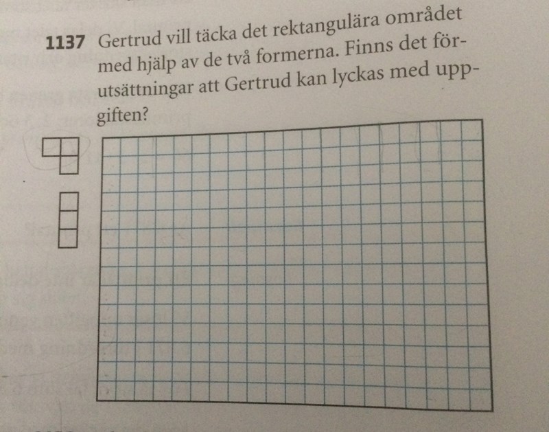 Hur ska man lösa en sådan uppgift? Det ända jag vet är att det inte kommer att gå då antalet rutor (14*20=280) inte är delbart med tre. Men det jag inte fattar är att hur kan uppgiften lösas bara genom att att veta att 280 inte är delbart med 3. Det är två olika figurer med olika former och figurerna går att vridas.Helt rätt tänkt! Oavsett hur många figurer du använder och hur du än vrider och vänder på dem så kommer de alltid att täcka ett antal rutor som är jämnt delbart med 3. Och eftersom 280 inte är jämnt delbart med 3 så kommer det inte att gå att helt täcka det rektangulära området.