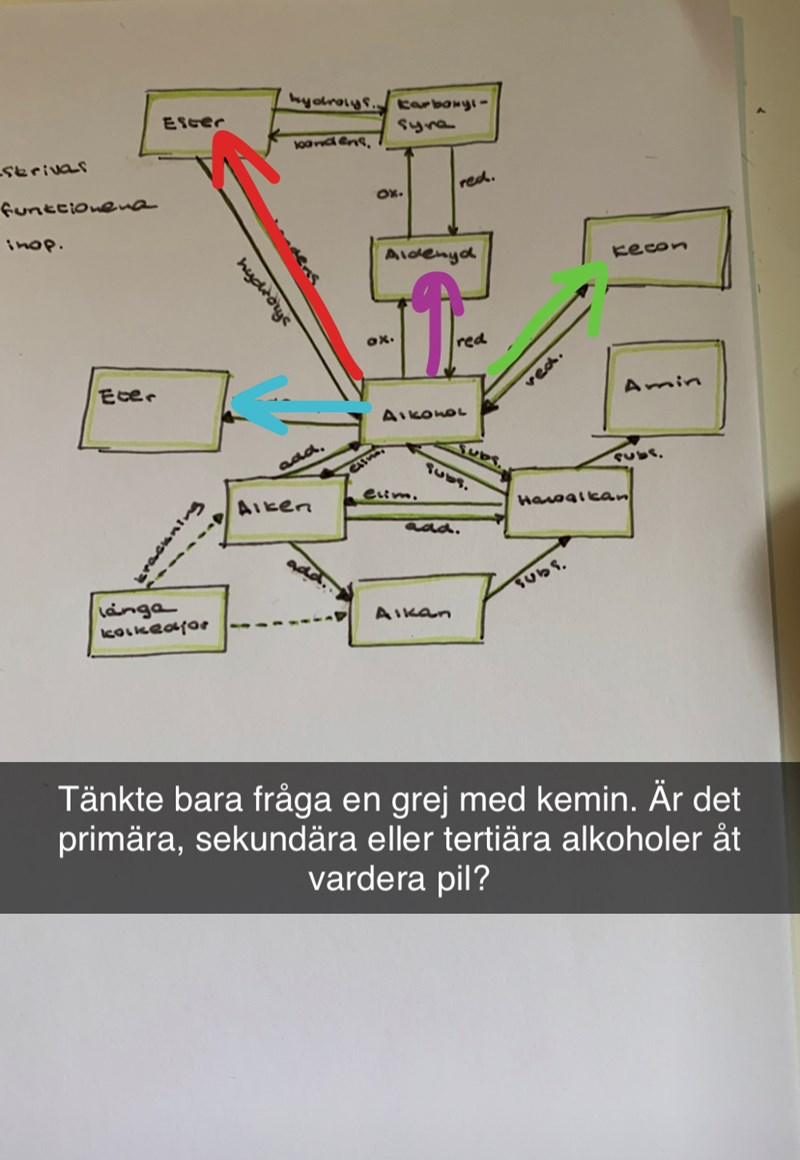 Smaragdalena skrev:Den lila pilen är primära alkoholer. Den gröna pilen är sekundära alkoholer. Den röda och den turkosa pilen kan vara vilken sorts alkoholer som helst eftersom det är vätet på OH-gruppen dom reagerar.
