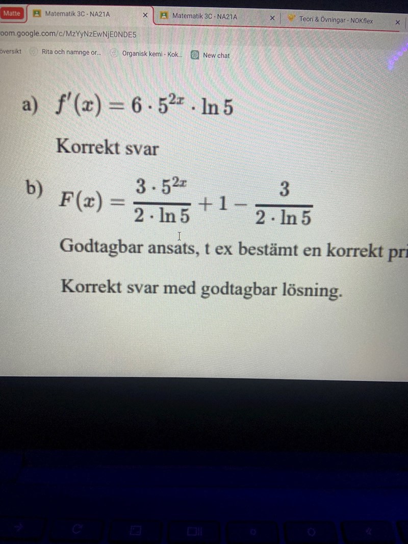 ln 52x = (ln5)*2x men som du skriver kan man tro att det är ln (5*2x) som är något annat.