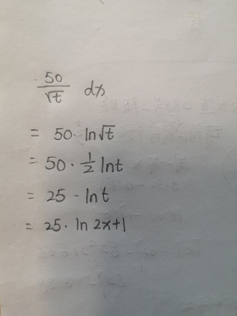 Hej,vet inte riktigt hur man ska integlera funktionen. Tänkte på 25*ln2x-1. Men det verkar som att det inte är rätt.Tack på förhand.Önskar alla ha en bra dag.