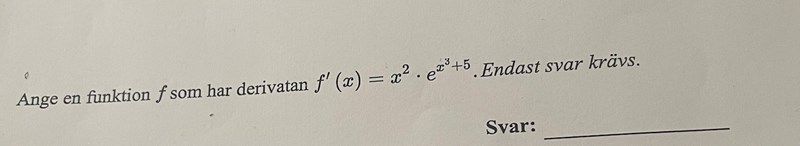 Man får nyttja kedjeregeln. Det gäller att f'(x)=g'(h(x))h'(x) för f(x)=g(h(x)). I fallet så kan man få ut att h(x)=x^3+5 och då h'(x)=3x^2 som inre funktion respektive inre derivata. Har också g(z)=e^z=g'(z) som en yttre funktion. (I förra inlägget skrev jag att svaret blev men svaret blir pga den inre derivatan :(