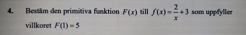 Bestäm den primitiva funktion F(x) till f(x)=2/x+3 som uppfyller villkoret F(1)=5.