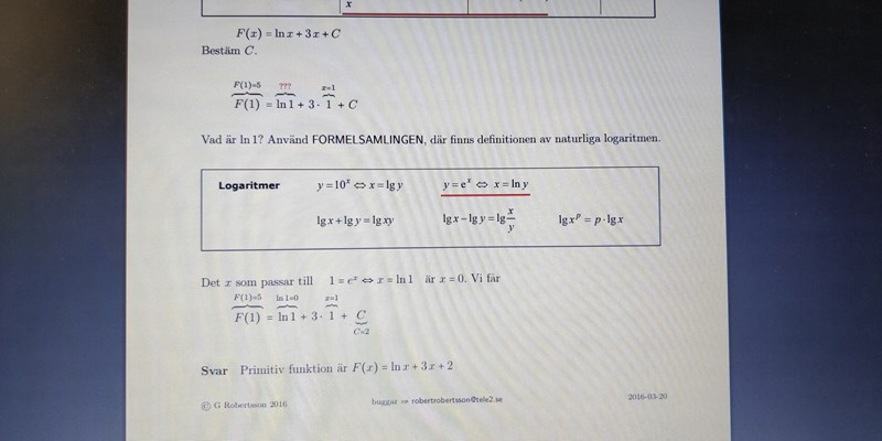 Facits svar som det står här är fel (kontrollderivera!), men de kanske petar in tvåan i logaritmen
