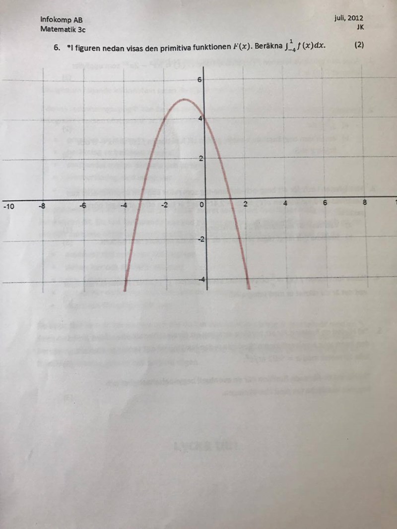Det vanliga, när du skall räkna ut en integral, är att du har en funktion (eller en graf som visar själva funktionen), och att du integrerar funktionen, får fram den primitiva funktionen och beräknar integralen som (värdet av primitiva funktionen i ena änden) - (värdet av primitiva funktionen i andra änden). Men i den här uppgiften har du en graf som föreställer den primitiva funktionen. Det här är en sån där "hemsk" uppgift som testar om man har förstått, inte om man kan räkna.