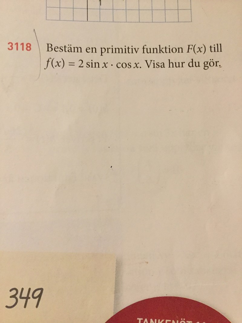 naturarecheck skrev:Om man ska bestämma en primitiv funktion till en produkt måste man väl skriva om funktionen. I detta fall skriver man väl om den till sin2x för att kunna bestämma den primitiva funktionen?