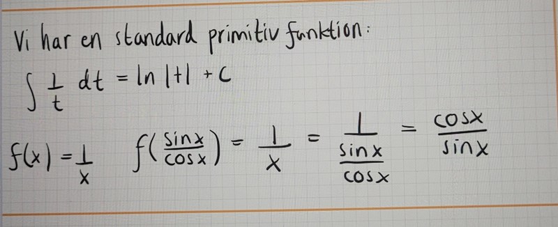 Hänger inte med, jag vet i alla fall att man kan substituera den inre funktionen till t. Men jag har ingen inre funktion? Eller är cos x=t och dt=1 dx?