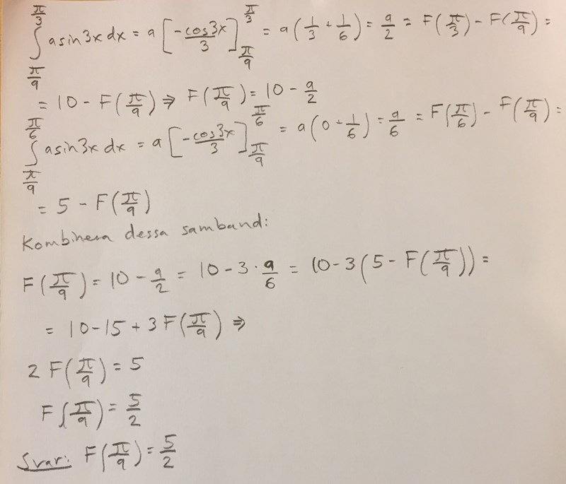 Funktionen f(x)=a sin3x har en primitiv funktion som uppfyller villkoren