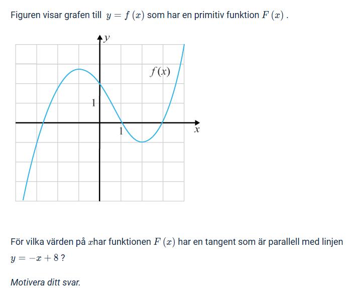 Vet inte vart jag skall börja. Jag tänker att den primtiva funktionen i någon punkt måste ha lutning -1. Vet dock inte hur jag ska få fram den primitiva funktionen.