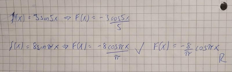 Jag sitter med primitiva funktioner och har stött på två uppgifter där facit gör mig väldigt konfunderad. Den övre uppgiften löste jag och fick rätt svar, medan den nedre som ser väldigt lik ut bortsett ifrån att 3X är ersatt med piX. Svaren blir olika, enligt facit ska man inte dividera hela uttrycket med pi i den nedre utan först dividera 8 med pi och jag förstår verkligen inte varför?