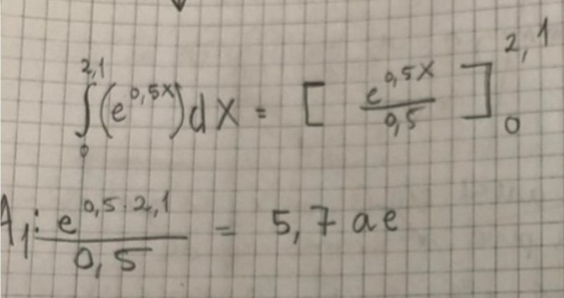 Din andra integral stämmer inte. A2 är lika med integralen av funktionen g(x) = 5-x från x = 2,1 till den högra integrationsgränsen, dvs till den punkt där grafen till g(x) skär x-axeln.