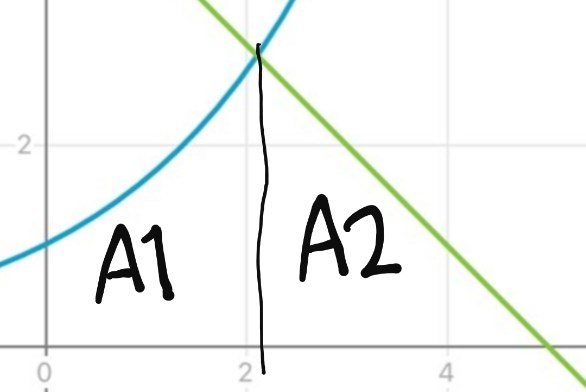 x= (ln(5-x))/0.5 är där de skär varandra. Det är även den högra integrationspunkten. Den vänstra integrationspunkten är 0