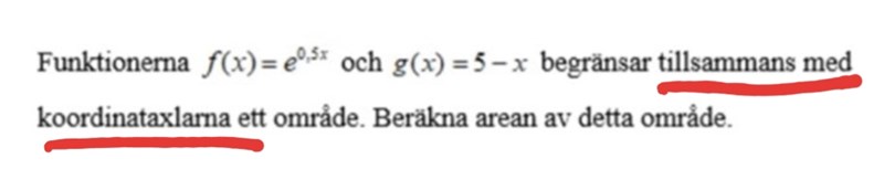 Läs uppgiften: funktionen f(x) och g(x) begränsar tillsammans med koordinataxlarna ett område. Det betyder att både x-axeln och y-axeln är gränser för området.