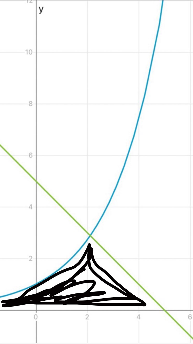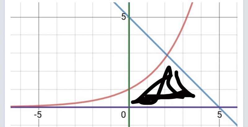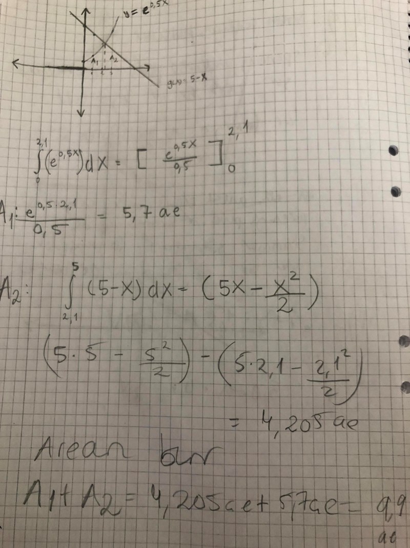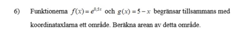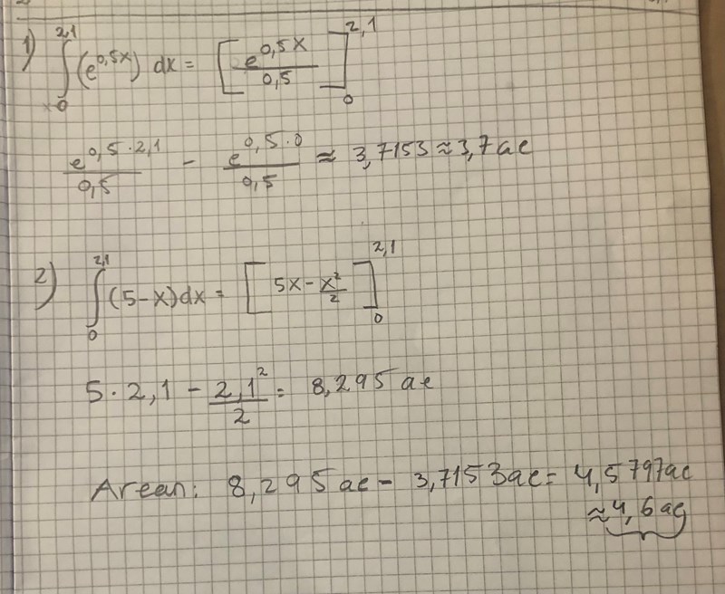 Jag har beräknat att skärningspunkten mellan graferna e^0.5x och 5-x . Blir i där x=1,887704. Integrationsgränsen blir alltså x=0 och x=1,887704 .