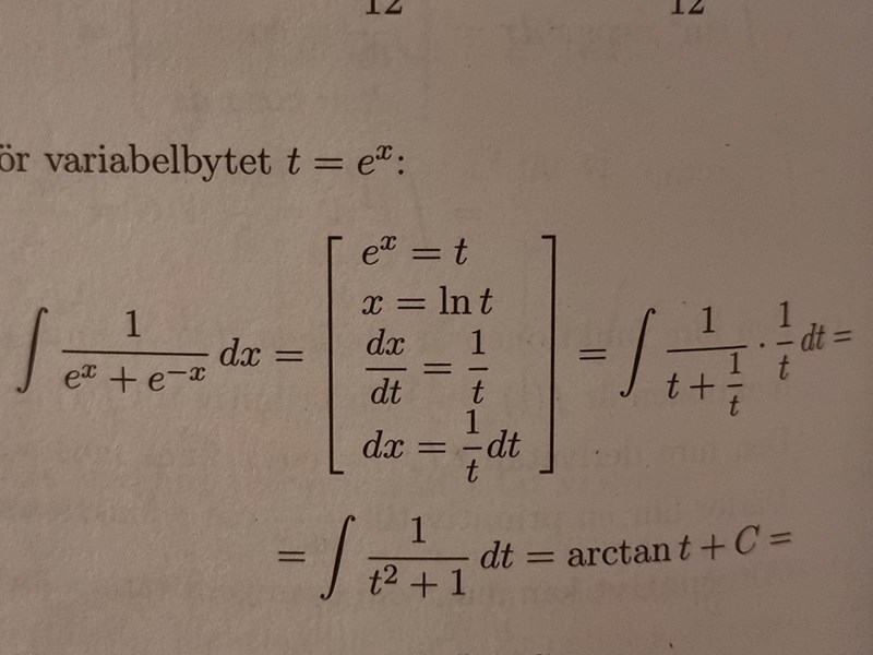 Jag håller på att kolla på variabelbyte när man gör primitiva funktioner och förstår inte varför e^-x blit 1/t och vart gånger 1/t kommer ifrån??