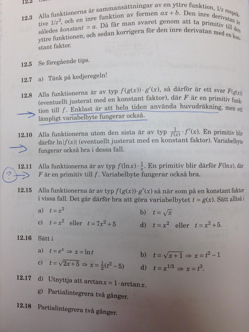 Det som står vid 12.11 - det handlar om att hitta primitiver till uppgifter som (1/x)*(ln(x))^2. Vad menar de med den texten som syftan på/hint till hur man ska lösa uppgifter som denna?