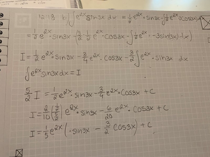Faktorn du har i sista integralen på första raden skall ju multipliceras med båda termer i parentesen på raden under, men du har bara multiplicerat den med den första termen.
