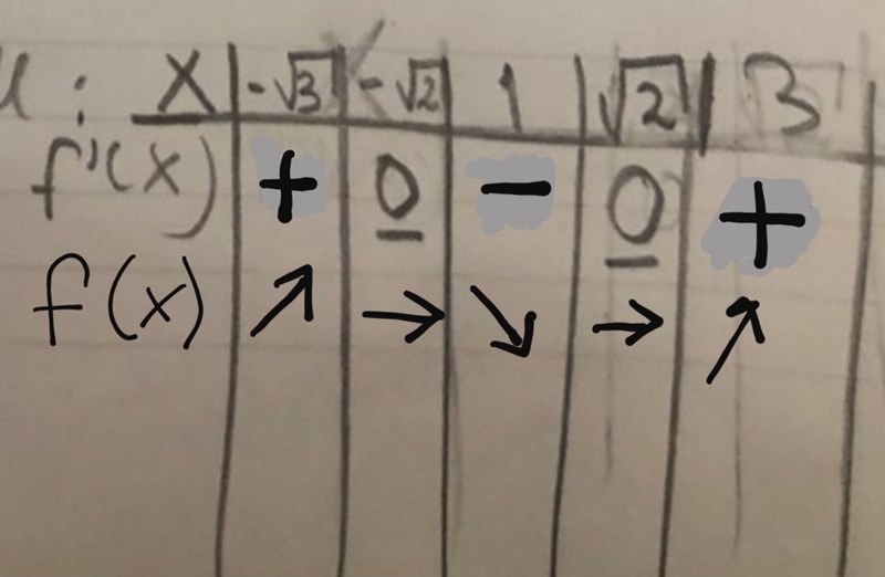 Derivatan vid x=-3x=-\sqrt{3} är positiv, inte negativ.