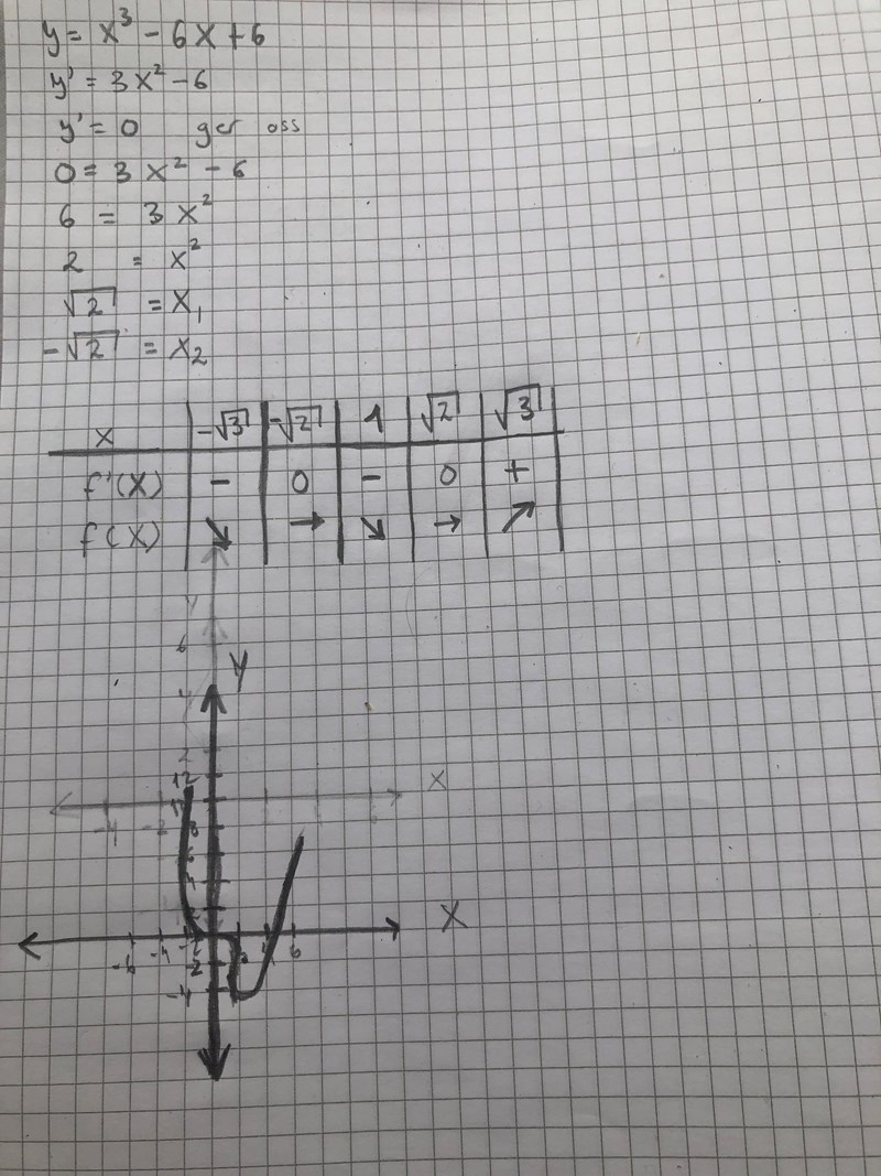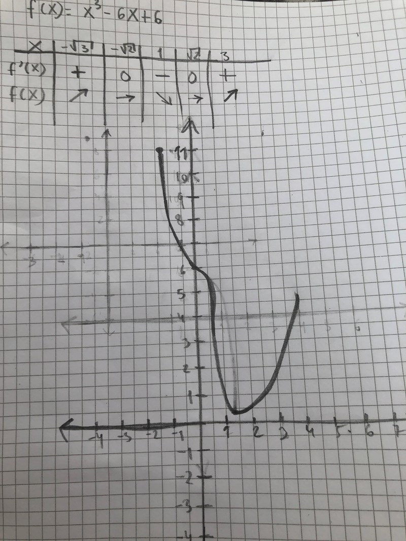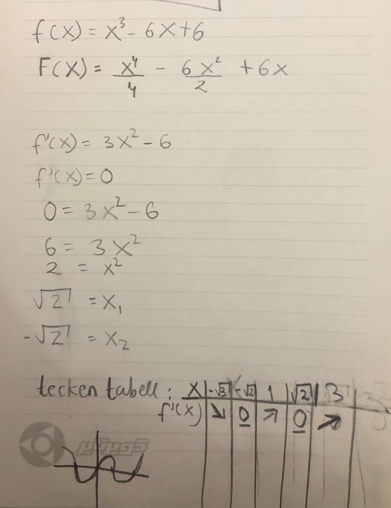 Maxipunkten är roten ur 2. Minimipunkten är minus roten ur 2. Jag förstår inte hur många primitiva funktioner det kan finnas till en enda funktion. Är det inte så att det bara finns en primitiv funktion till en funktion? Jag fick fram att den primitiva funktionen för f(x)=x^3 -6x+6