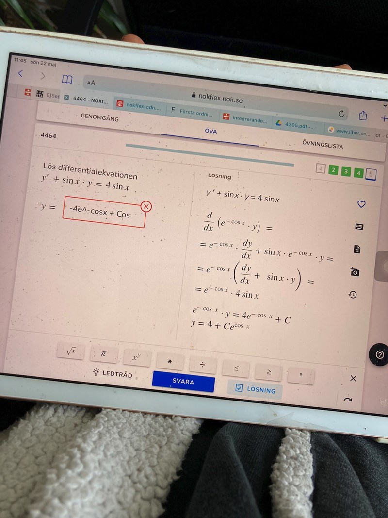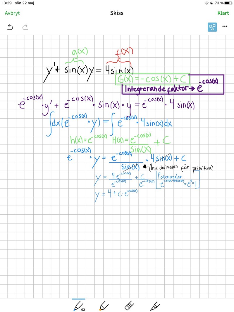 Hej tycker inte riktigt facit förklarar om jag gjort rätt. Har kommit fram till samma svar men vet inte om jag gjort rätt med den primitiva funktionen. Tänkte att den primitiva blir som att dividera på den inre derivatan dvs derivatan till -cos(x) —> sin(x). Stämmer mitt resonemang?