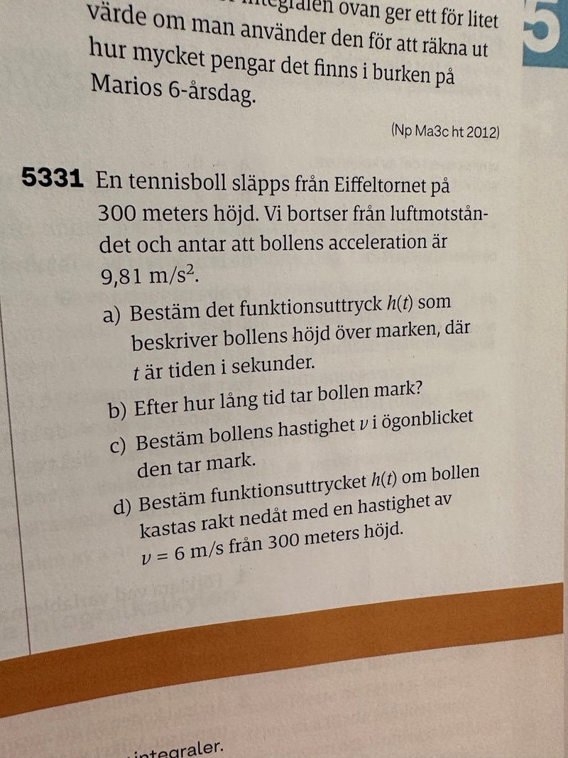 På samma sätt blir h(t) = -gt2/2+Ct+D, där konstanten D kan bestämmas ur villkoret h(0) = 300.