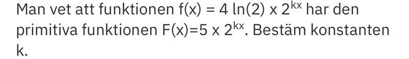 Man vet att funktionen f(x) = 4 ln(2) x 2kx har den primitiva funktionen F(x)=5 x 2kx. Bestäm konstanten k.