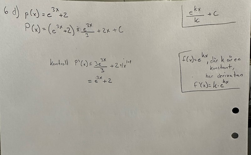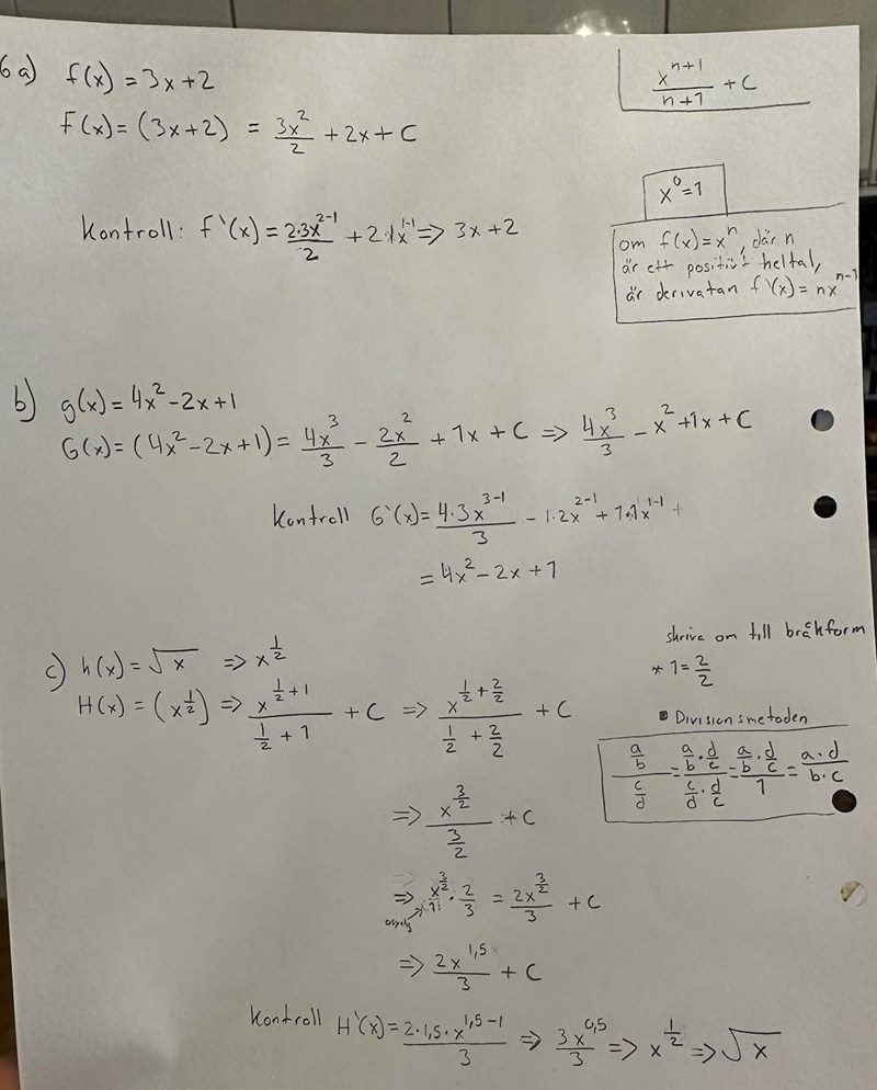 Tänk på att du alltid kan testa om din primitiva funktion är rätt. (Och glöm inte integrationskonstanten!) Derivera det du har fått fram. Vad får du?