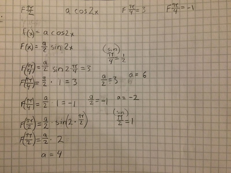 Om f(x)=a cos(2x) så är F(x)=(a/2)sin(2x)+C. Du behöver de båda villkoren från uppgiften (om de hade varit riktiga) för att kunna bestämma de båda konstanterna a och C.
