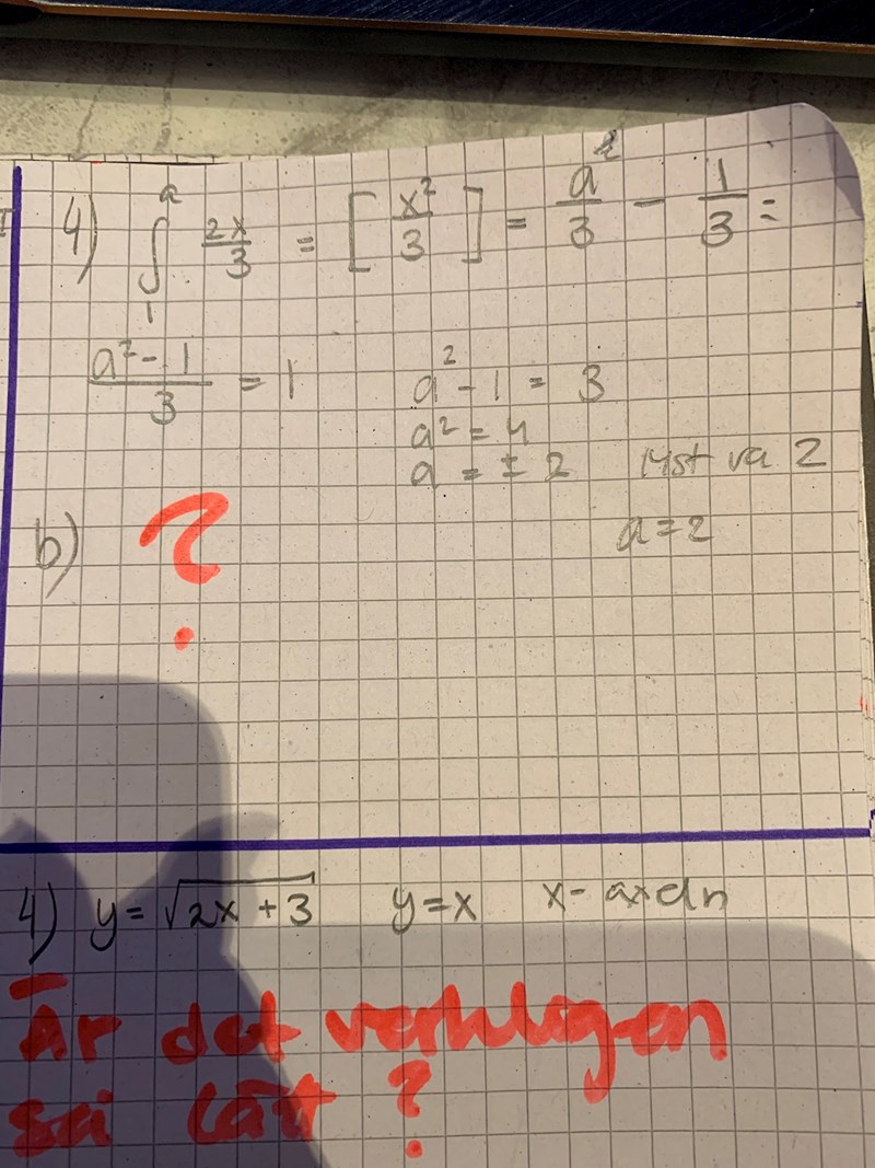 Din första bild är så liten och suddig att jag har svårt att tyda den. Gissningsvis har man ritat b-frågan för ett godtyckligt a, inte för det värde man har räknat fram. Är texten på b-uppgiften "Interalen i ekvationen kan tolkas som en area. Rita en figur som visar denna area."